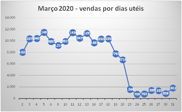 Uma vez iniciada a quarentena, as vendas despencaram. No dia 23, uma segunda-feira, foram vendidos minguados 1.242 automóveius e no dia seguinte pouco mais de 700 unidades.
